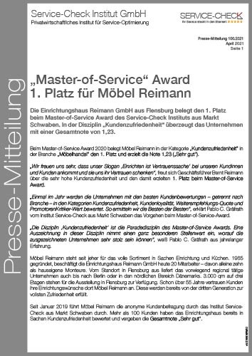 „Master-of-Service“ Award 1. Platz für Möbel Reimann